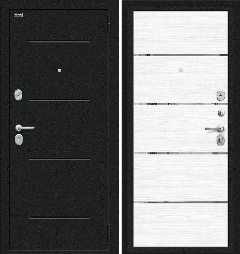 Надежная входная Дверь Браво Лайн Букле черное/Snow Melinga премиум класса по цене 30 310 руб. Большая толщина стали защитит от проникновения в ваш дом, квартиру или коттедж. Используется очень качественная фурнитура: замки, цилиндры, ручки, защелки. Покрытие и отделка двери изготовлено под внимательным контролем производителя. Дверь имеет долгий срок службы и гарантию.