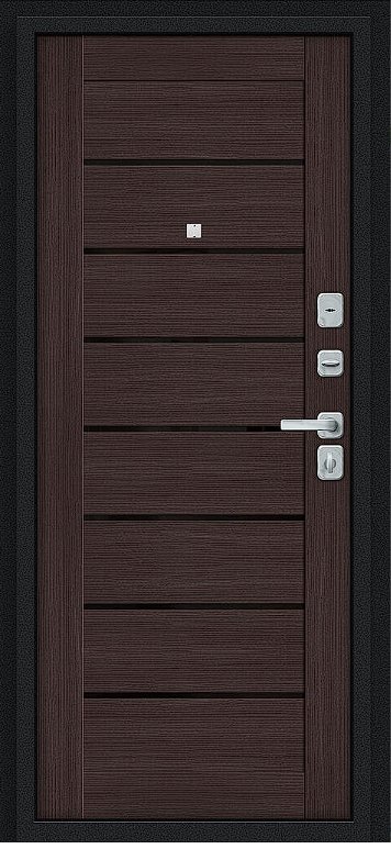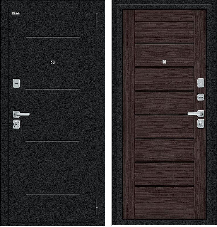 Надежная входная Дверь Браво Техно/BChrome Букле черное/Wenge Melinga премиум класса по цене 35 240 руб. Большая толщина стали защитит от проникновения в ваш дом, квартиру или коттедж. Используется очень качественная фурнитура: замки, цилиндры, ручки, защелки. Покрытие и отделка двери изготовлено под внимательным контролем производителя. Дверь имеет долгий срок службы и гарантию.